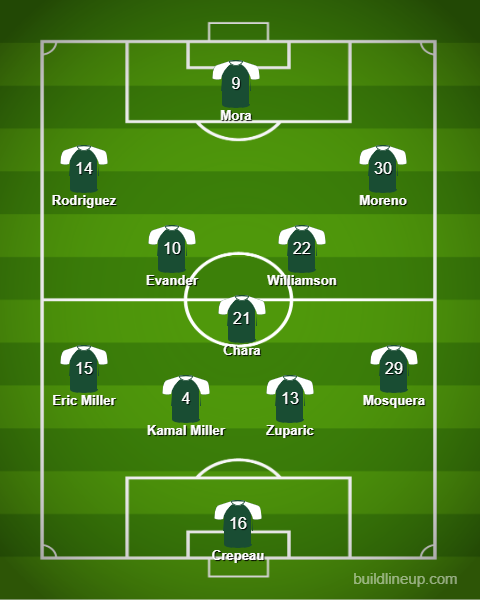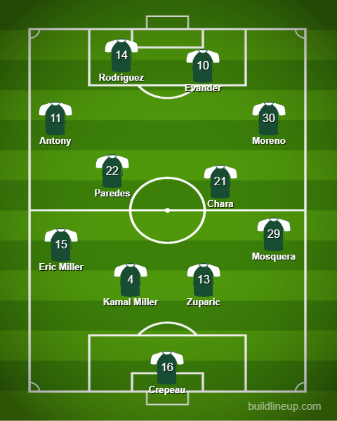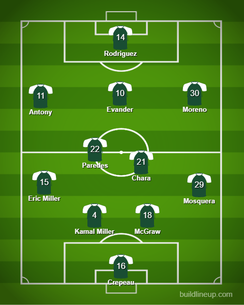 Moreno worked super hard throughout the game, but he does his best work in the middle of the field. He's not technical on the outside, whereas he is on the inside. I'd start him as an 8/10 alongside Evander like you say. Williamson isn't a 90 minute player, so I'd sub him on for either Evander or Moreno, or do that with Paredes. Excellent point about Chara - he did come alive in the second half, and he works better in a pressing scheme, and maybe less so with possession, although he would have less to do with Evander and Moreno controlling the middle. It's nice to have Rodriguez as the 9, but it might be worth checking out Mora starting at the nine and Rodriguez LW and Antony on RW. Let's go!